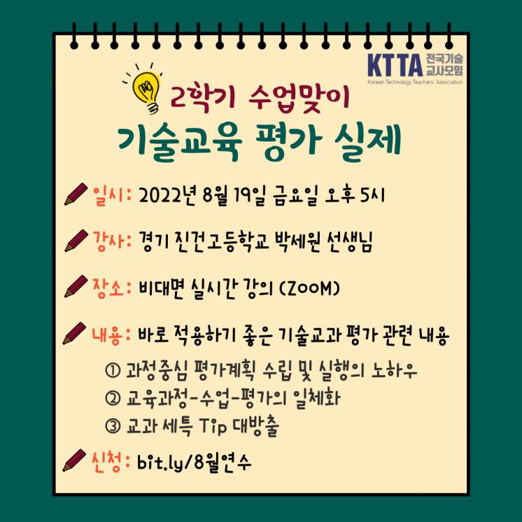 8월 자율연수 <2학기 수업맞이 기술교육 평가 실제>를 안내합니다^^