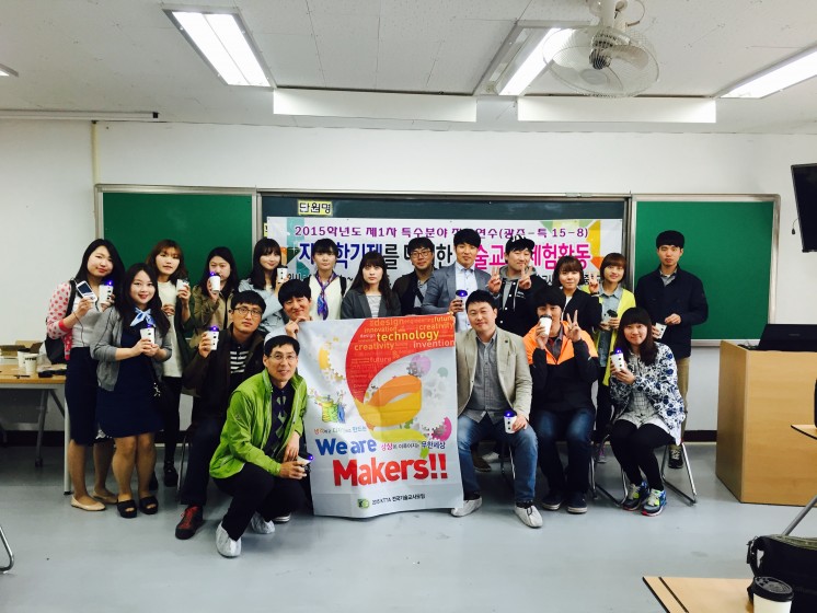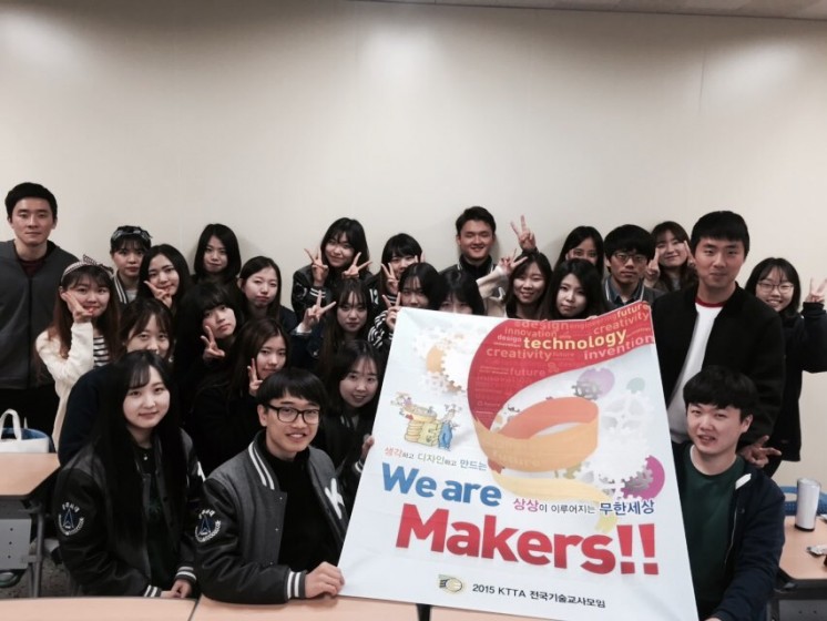 그 현수막을 학교 기술실에 걸고 학생들과 인증샷을 찍어서